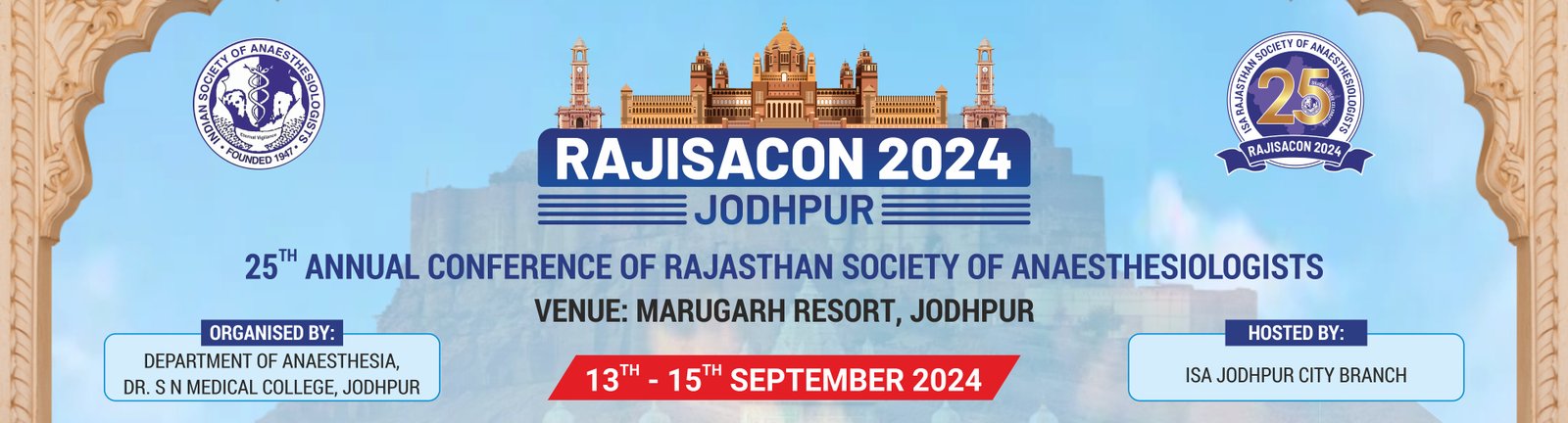 It gives us immense pleasure to invite you to attend the 25th Annual Conference of Rajasthan Society of Anaesthesiologists “RAJISACON 2024” to be held on 13th - 15th September 2024 at Jodhpur. This conference is being organized by Department of Anaesthesia, Dr. S. N. Medical College, Jodhpur and hosted by ISA Jodhpur City Branch.